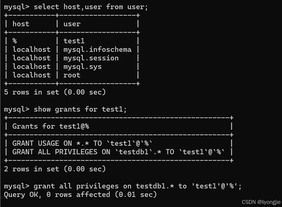 grant all privileges on db1.t1 to "user1"@'%';