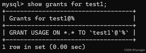 USAGE ON*.* 表示该用户对任何数据库和任何表都没有权限