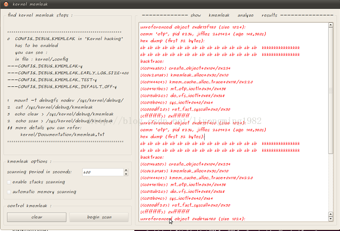 7 检测 kernel memory leak : (可以设置 清除 ,开始,停止,是否扫描stack 等)