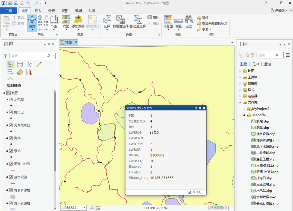 选中要素类之后,直接按住鼠标不放,将其拖进地图窗口中,实现多个图层加载。ArcGIS Pro已经没有了ArcMap中的【标准工具】了,没有了缩放工具和平移工具。缩放地图则需要采用鼠标滚轮,按住鼠标左键不放进行拖拽实现地图平移,默认点击地图位原来的识别操作。可以说,在地图操作上不需要做任何操作状体的切换,全部有Pro自行识别,这一点还是比较友好。使用识别工具操作的时候,会先采用高亮蓝色表示选中,然后这个蓝色会逐渐扩散,最后完全消失,带有不错的动画显示效果,不像ArcMap那样直接给一个高亮蓝色显示。