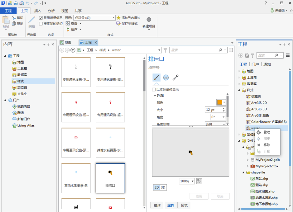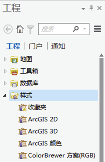 在制图方面,ArcGIS Pro还是可以直接使用之前ArcMap的符号库,这让工作的迁移方便了不少。符号库不再从菜单里面调出来,而是在工程面板中调用。工程面板中默认已经带有【样式】选项,下拉之后可以看到集成进去的几个符号库的常规方案。这跟ArcMap的符号库还是有一定的组织结构上的区别。