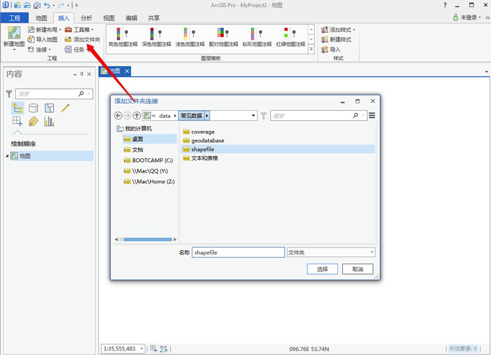 要是完全的新建一个地图,其操作跟ArcMap类似,可以在工程中创建文件夹连接,并将数据加载到其中。或者直接在工程默认的gdb中导入自己的数据。下图是使用了【添加文件】的方式进行数据连接。
