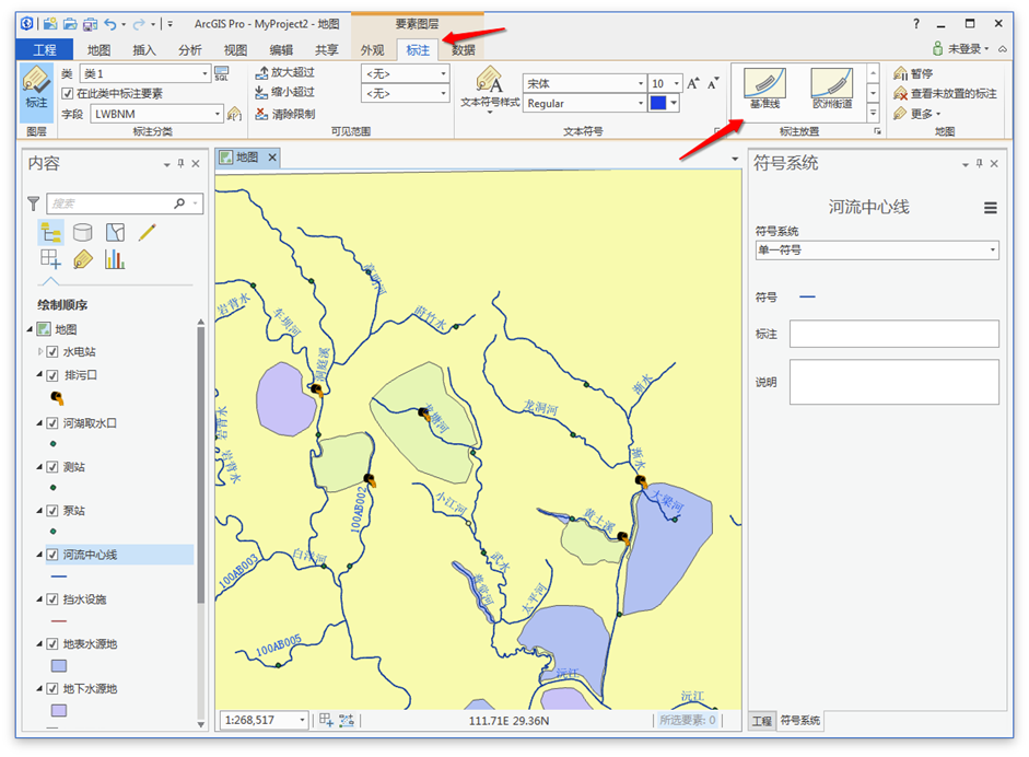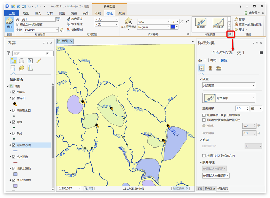 在标注设置方面,也是选中图层,然后标签页会自动提示到【图层要素】的大标签选项,并且在【标注】小标签中显示所有的设置,例如分类、可见比例、标注样式、标注放置方式等,基本上将以前普通标注引擎和Maplex引擎的选项非常柔和的融合在一起。