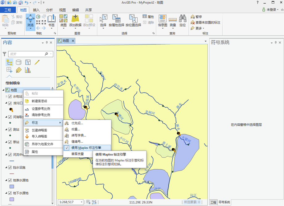 关于标注方面,默认使用的时Maplex引擎。原则上Esri在Pro上是不分标注引擎的,标注引擎是ArcMap上的一个特点,但在ArcMap10.1以后,Maplex就成为了ArcView级别上的主模块的功能,不存在另外收费的问题。但在Pro中还依然保留着可以切换到非Maplex引擎,估计是对非常老的版本的支持吧。在内容列表的右键中,可以选择是否使用Maplex引擎,但默认都是开启的,而且界面还算比较友好,已经将一些Maplex常规的操作引入到右键菜单中了,例如优先级、权重等。