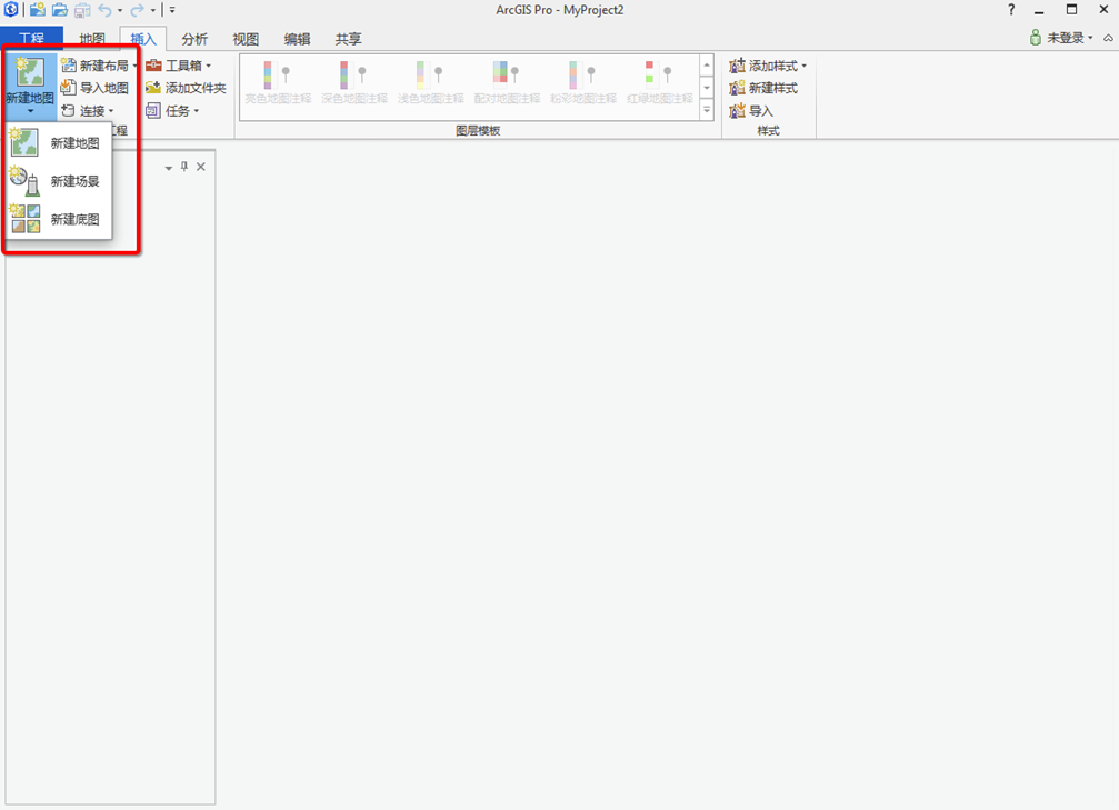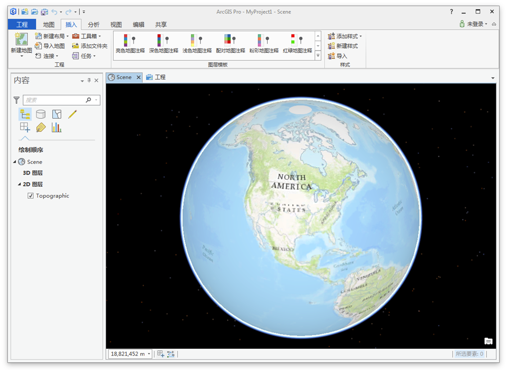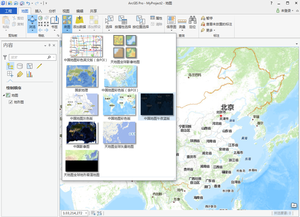 新建一个空的工程,然后新建地图,可以看到默认加载一个网络地图,这一点与ArcMap区别很大,如果不登陆Portal的话,Pro默认加载的底图来自于ArcGIS Online,会根据当前网络位置选择不同国家的地图。如果用户只有少量的数据,缺乏基础的地图,这是非常好的一种模式。关于底图方面,ArcGIS Pro还可以选择多个不同的底图,在1.3版本中,已经可以连接到网络使用天地图的底图了。