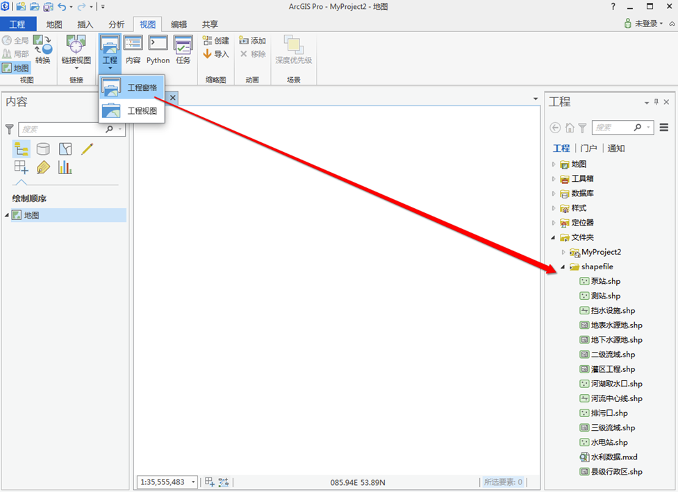 由于Pro的界面设计不再是下拉菜单的模式,因此,类似ArcMap的【窗口】菜单是没有了,可以在【视图】标签中选择【工程】按钮,下拉后选择【工程窗格】,这样可以查看到工程的一些资源,如上一步连接的文件夹,如下图所示