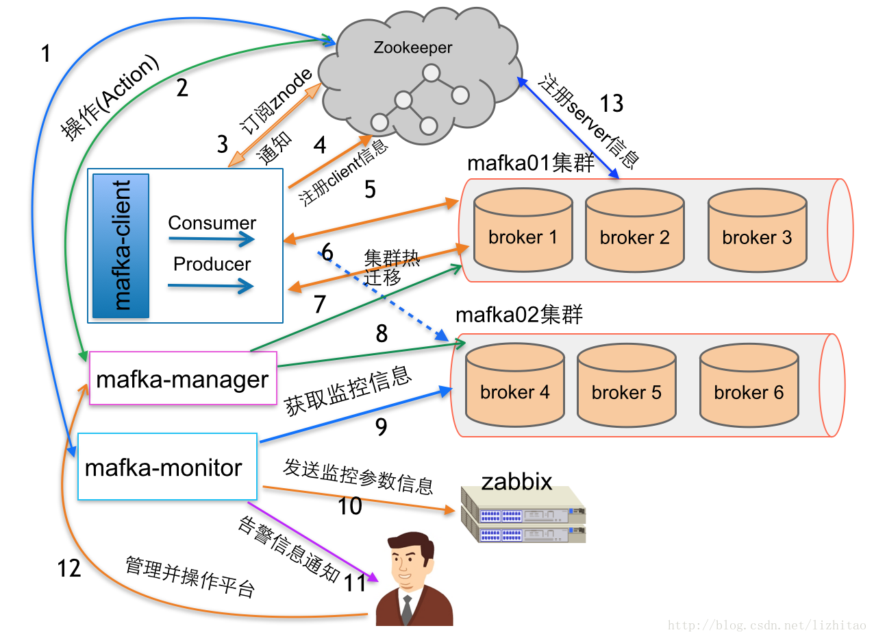 mafka集群:由多个broker组成的mafka集群(作为服务端)用于存储消息。