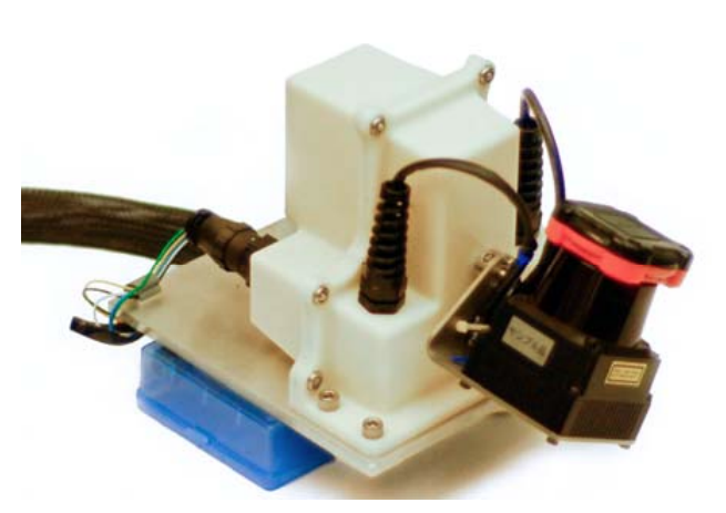 图2. 研究中使用的3D Lidar由电机驱动旋转运动的一个Hokuyo激光扫描仪和一个测量旋转角度的编码器组成。这个激光扫描仪由180°的视角和0.25°的分辨率。扫描速率是40 lines/sec。以激光扫描仪水平时为0,控制电机在-90°~90°之间旋转。