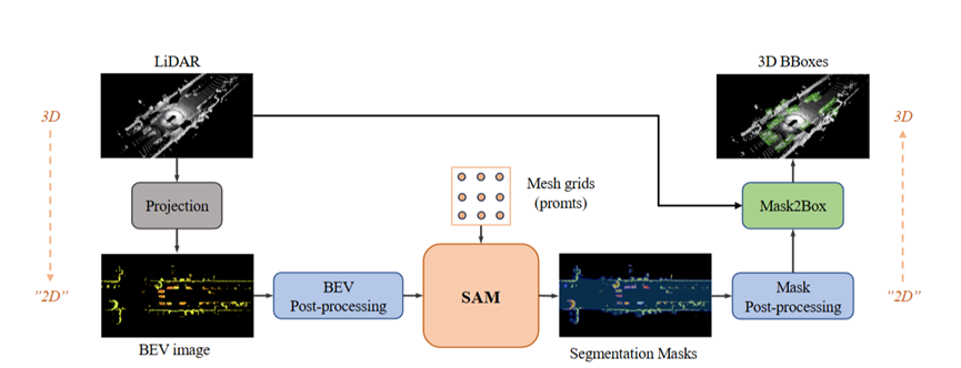 SAM3D Zero-Shot 3D Object Detection via Segment Anything Model 本篇文章讲述的是一个3D的目标检测模型,主要是使用BEV将3D的图像转变成2D的图片,然后使用SAM进行分割预测对象。模型由zero-shot的能力。