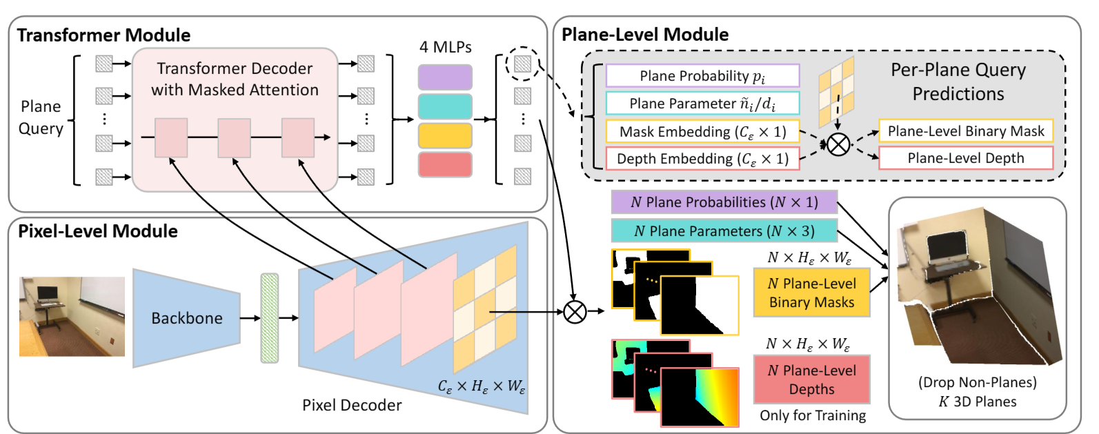 PlaneRecTR: Unified Query learning for 3D Plane Recovery from a Single View 本文介绍了以一个基于Transformer的模型,使用了可学习的query,可以处理像平面检测,平面分割,平面参数估计,平面深度估计等和平面相关的任务。