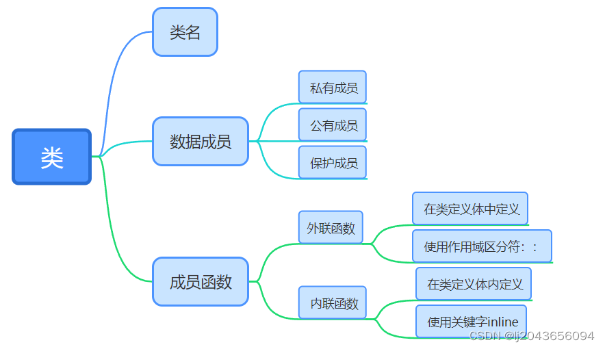 类和对象基本概念 外联成员函数:在类定义体中或体外定义的成员函数,(注意:在体外定义时需要在类名和函数名之间加上作用域区分符::);内联成员函数:在编译时将内联成员函数的代码插入到函数的每个调用处,提高程序的执行效率。1.不能加void;描述该类对象属性的一些数据成员,只有本类的成员函数或某些特殊说明的函数才能访问 ,实现了访问数据权限的控制,有效保护了数据,这种函数的作用是支持其他函数的操作,是外部的接口;在一般情况下与私有成员相同,区别在类的继承中产生的新类的影响不同(一般先写public,后写private)。