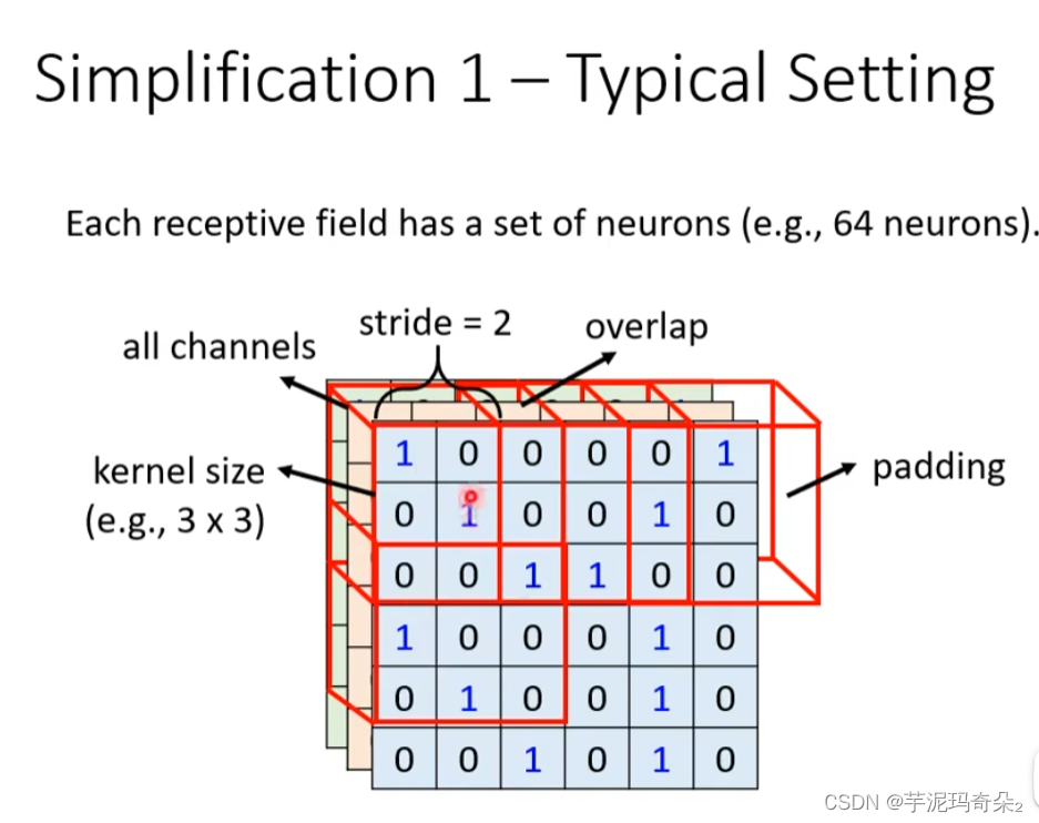 卷积神经网络(CNN) 在进行卷积的时候需要定义一个kernel size作为卷积提取特征的范围,一般采用3x3的格式,除此之外还需要设定步长进行移动方便找到重要的特征,一般用1或者2作为步长。当receptive filed移动到边缘的时候会缺少数据,这时需要采用padding(填充)的方式补齐数据,补齐的数据可以是全为0,也可以是整个数据的平均值。为了简化模型有时候我们会让一些neurons共享参数,因为他们的receptive filed范围不同,所以即使参数相同,他们的输出值也是不同的。Step 3:计算输出层的总误差。