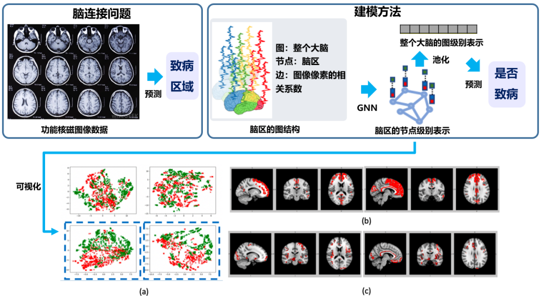中医讲究“对症下药”,只有确定疾病的症结所在,才能更好地予以治疗。Li等人[2]为找出某种脑部疾病的致病区域,先将脑划分为若干个区域,然后输入GNN中学习。最后,对148块大脑区域进行可视化,线性可分的说明与致病更相关。由此,作者发现了31块较明显的线性可分的大脑区域,即在图(b)、图(c)中标记为红色的区域。