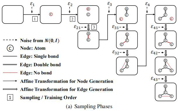 对于许多分子,尤其是设计出的或者未知的分子,我们很难直接得到其三维立体结构。这就需要根据低维的分子表示,预测出该分子的一个稳定的三维空间构象。Bengio团队提出CGCF [5]结合GNN和深度生成模型来尝试解决该问题。CGCF首先通过采样和变换生成初始的原子间距离矩阵,随后根据距离矩阵生成原子的坐标(即空间构象),最后通过蒙特卡洛采样算法来优化生成的构象,输出分子的三维表示。
