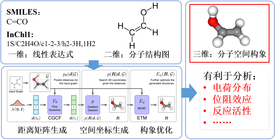 在成功设计新的分子后,我们希望根据得到的分子表达式或分子图,进一步研究该分子的化学性质(包括水溶性和毒性等)。为此我们通常先将分子表示为三维形态,以便精确地预测分子性质。