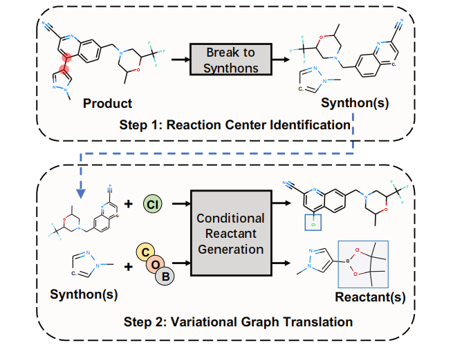 唐建教授团队基于GNN提出G2Gs [7],它将每个分子表示为一张分子图,并将逆合成预测抽象为产物图到反应物图的翻译的问题。G2Gs模型有很好的可解释性,整个框架包含两个阶段:反应中心识别和变分图翻译。反应中心识别模块把反应活性最高的原子对作为反应中心,通过断裂反应中心,将给定目标分子分割成多个合成子;而变分图翻译模块基于获得的合成子,通过一系列图变换生成最终的反应物。