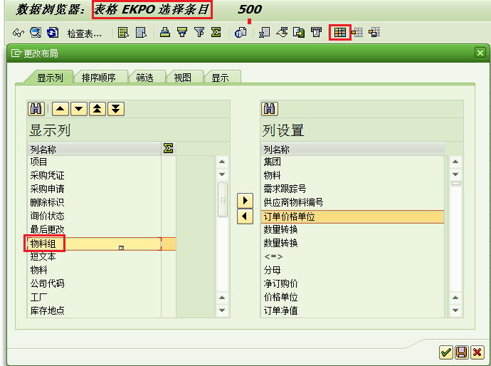 如果输出的清单中默认格式没有物料组,可以通过格式调整来自定义输出字段;