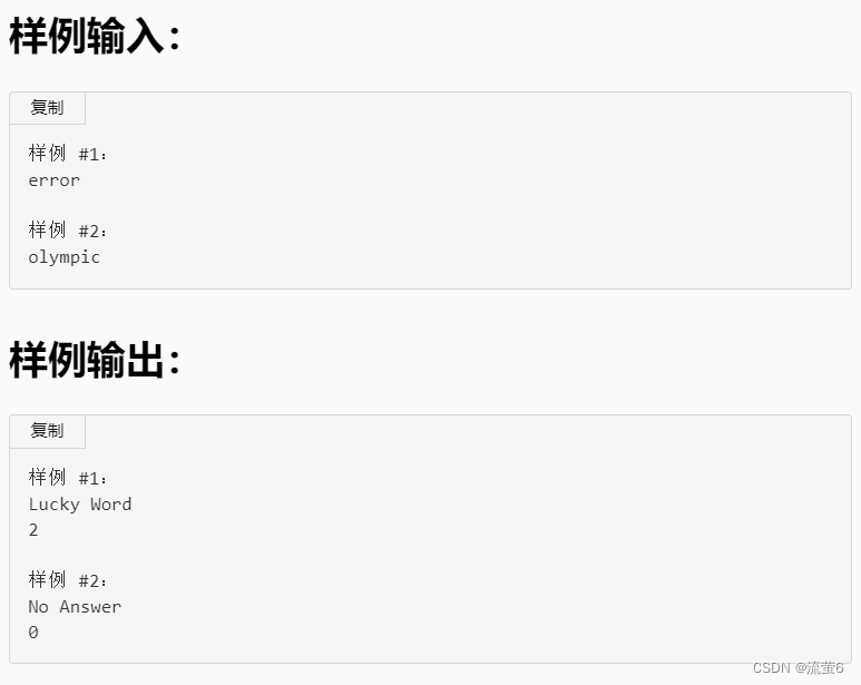 #include <cstdio> #include <cstring> #include <iostream> using namespace std; bool isp(int n){ if(n==1||n==0){ return false; } for(int i=2;i<n;i++){ if(n%i==0) return false; //判断是否为素数 } return true; } int main(){ char a[10000]; int max=0,min=9999; int n[100]={0}; gets(a); for(int i=0;a[i];i++){ n[a[i]-'a']++; //n[]数组代表26个字母出现的次数,每出现一次就+1 } for(int j=0;j<26;j++){ if(n[j]>max) max=n[j]; //找出出现次数最多和最少的 else if(n[j]<min&&n[j]!=0) min=n[j]; } if(isp(max-min)){ //相减判断 printf("Lucky Word\n"); printf("%d",max-min); } else{ printf("No Answer\n"); printf("0"); } return 0; } - 输入的时候