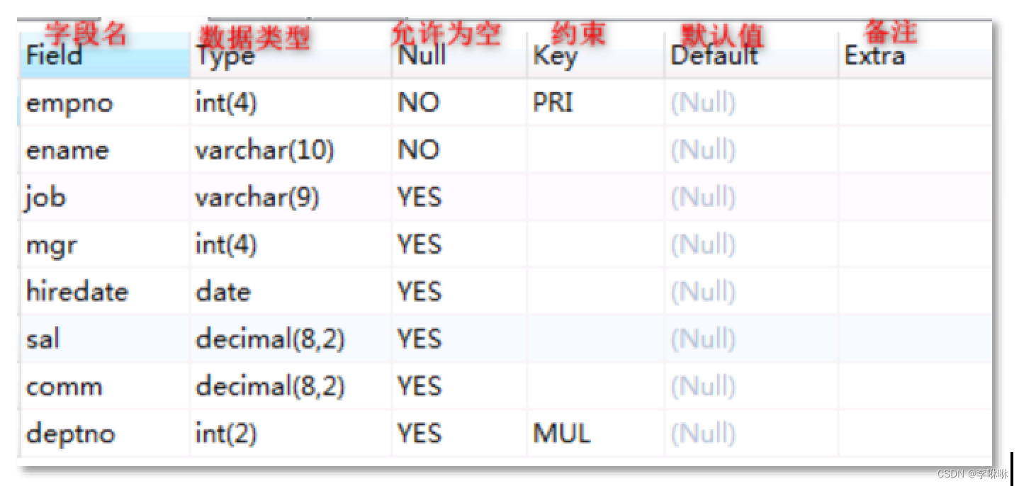 DESCRIBE 表名;