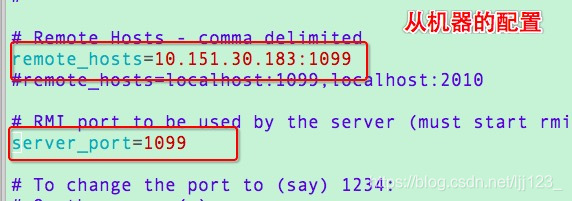 a、将主机器的JMeter/bin中的jmeter.properties文件,修改如下2处信息,