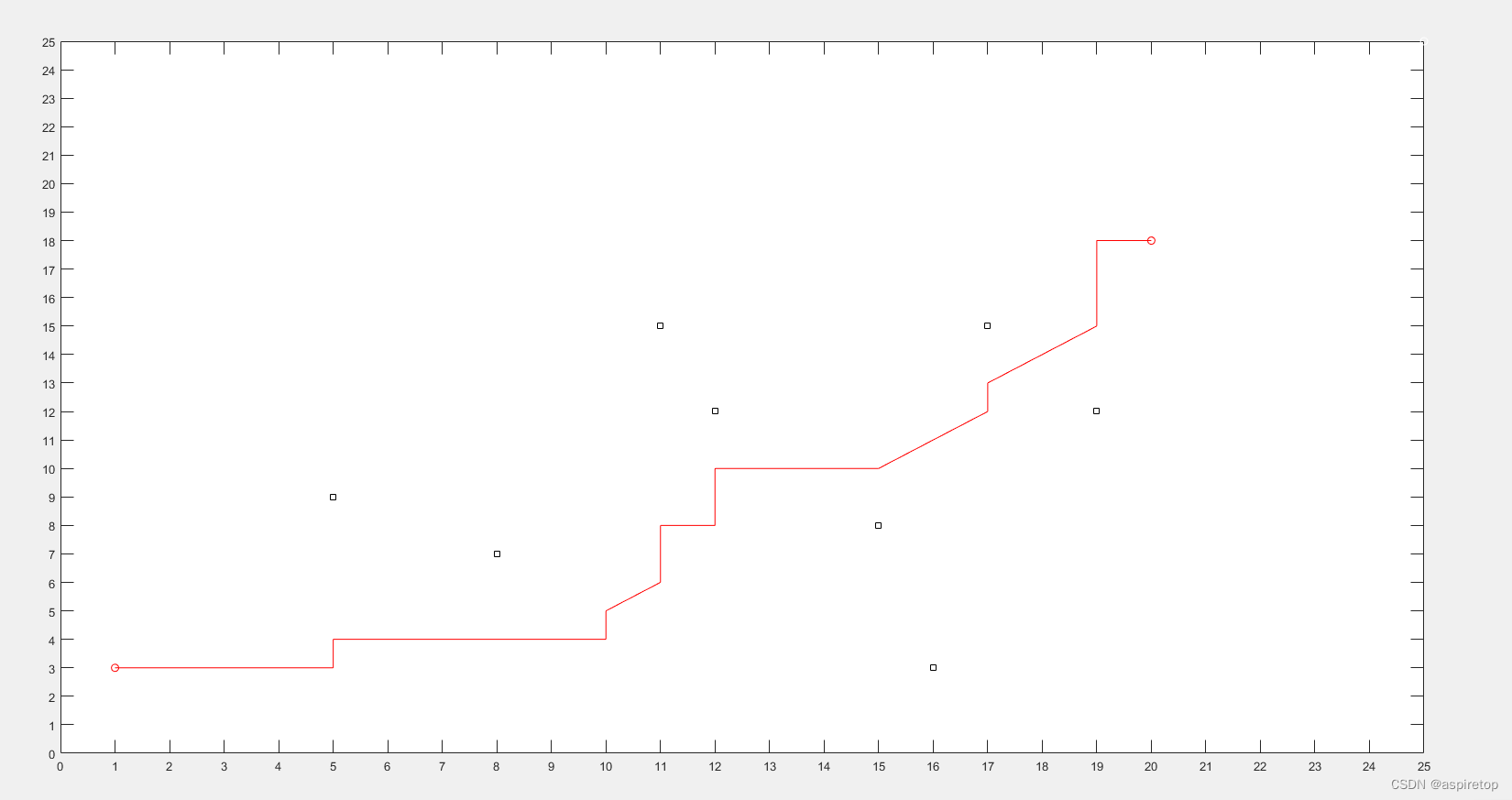 plot(xt,yt,'ks',xstart,ystart,'ro',xend,yend,'ro',25,25,'wo')%绘制障碍物 起点 终点 以及一个边界点