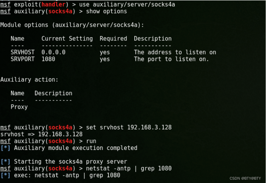 若要使用nmap一类的工具,需要使用msf框架中的socks4a工具代理,目录:auxiliary/server/socks4a