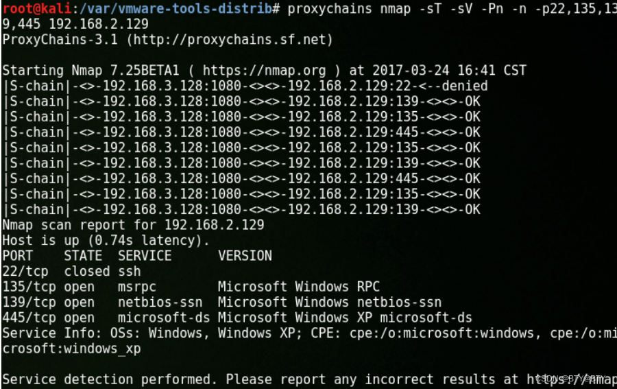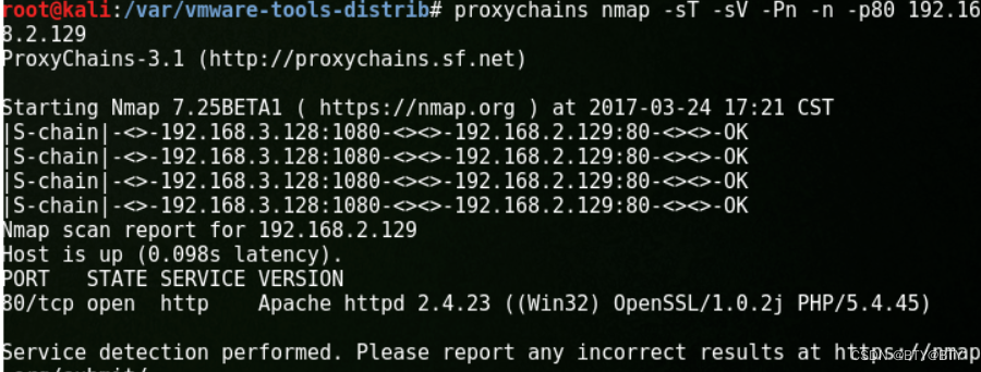 Proxychains 不支持ICMP协议,nmap要加-sT 和 -Pn 参数。