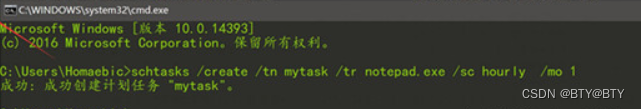 构造创建计划任务:schtasks /create /tn mytask /tr notepad.exe /sc hourly /mo 1 #每小时执行一次