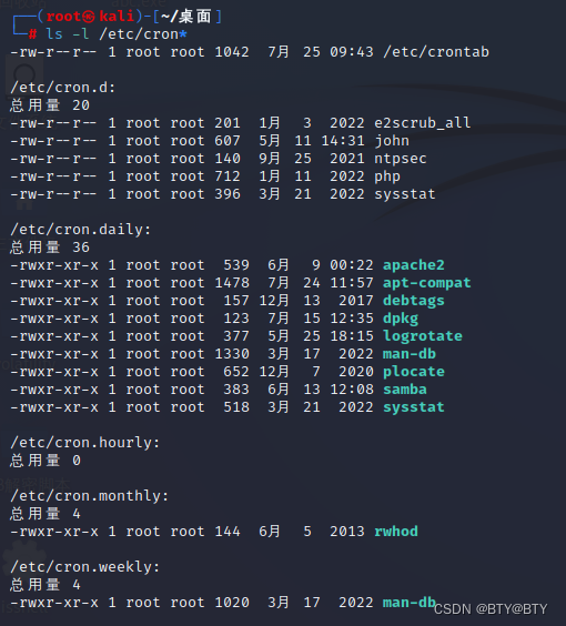 6. 使用命令 ls -l /etc/cron* 查看计划任务,也许会有脚本使自己成为root用户。