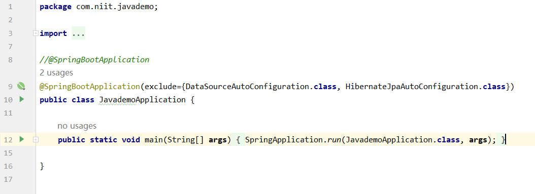 @SpringBootApplication(exclude={DataSourceAutoConfiguration.class,HibernateJpaAutoConfiguration.class})