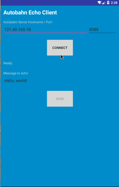 autobahn给出的demo我稍微做了修改,IP和端口号是我从网上找的一个在线测试地址,当点击Connect按钮后就会链接输入框给定的IP地址和端口号,然后进行链接操作,链接成功后通过Toast弹出服务器端返回的消息,表示Socket链接已经建立,可以进行通信了,然后我们可以在下方的输入框中输入任意内容给服务器,为了弄清楚通信过程,我们通过分析点击Connect按钮看看发生的流程,点击CONNECT按钮会调用start()方法,源码如下: