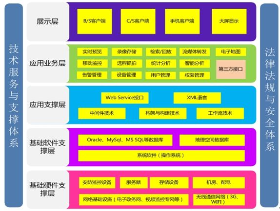整个视频监控管理平台在架构上分为五个层次,底层是基础硬件支撑层和基础软件支撑层,是支持整个系统运行必要的系统硬件和环境,网络基础设施包括了电子政务网、视频监控专网、无线通信网络等;数据库包含了系统支持的各中大型数据库软件;应用支撑层为整个管理平台提供了关键技术支持;应用业务层实现了整个视频监控管理平台的业务应用功能,面向环卫监管中心工作人员、系统管理员;展示层提供了多种用户交互的方式,包括B/S客户端方式、C/S客户端方式、手机客户端方式和大屏显示方式。技术服务与支持体系和法律法规与安全系统是整个系统建设、运行的必要保障。