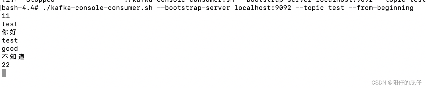 sudo docker exec -it kafka /bin/bash cd opt/kafka_2.13-2.6.0/bin/ ./kafka-console-consumer.sh --bootstrap-server localhost:9092 --topic test --from-beginning #若不想从头消费就使用 ./kafka-console-consumer.sh --bootstrap-server localhost:9092 --topic test