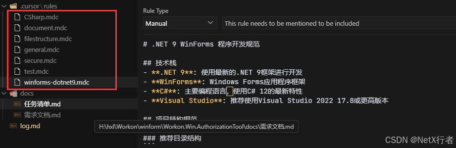 我要基于.net9、C#开发一个winform桌面应用程序,请从项目通用开发规范(规则文件为:general.mdc)、文档编写标准(规则文件为:document.mdc)、框架规则(规则文件为:winforms-dotnet9.mdc)、语言规则(规则文件为:CSharp.mdc)、项目目录结构规则(规则文件为:filestructure.mdc)、测试规则(规则文件为:test.mdc)、安全规范(规则文件为:secure.mdc)方面分别生成规则文件,并同时设置相应文件的Rule Type模式