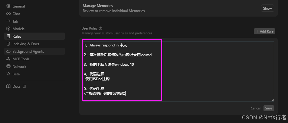 User Rules为全局性规则,即每个项目都遵循的规则。
