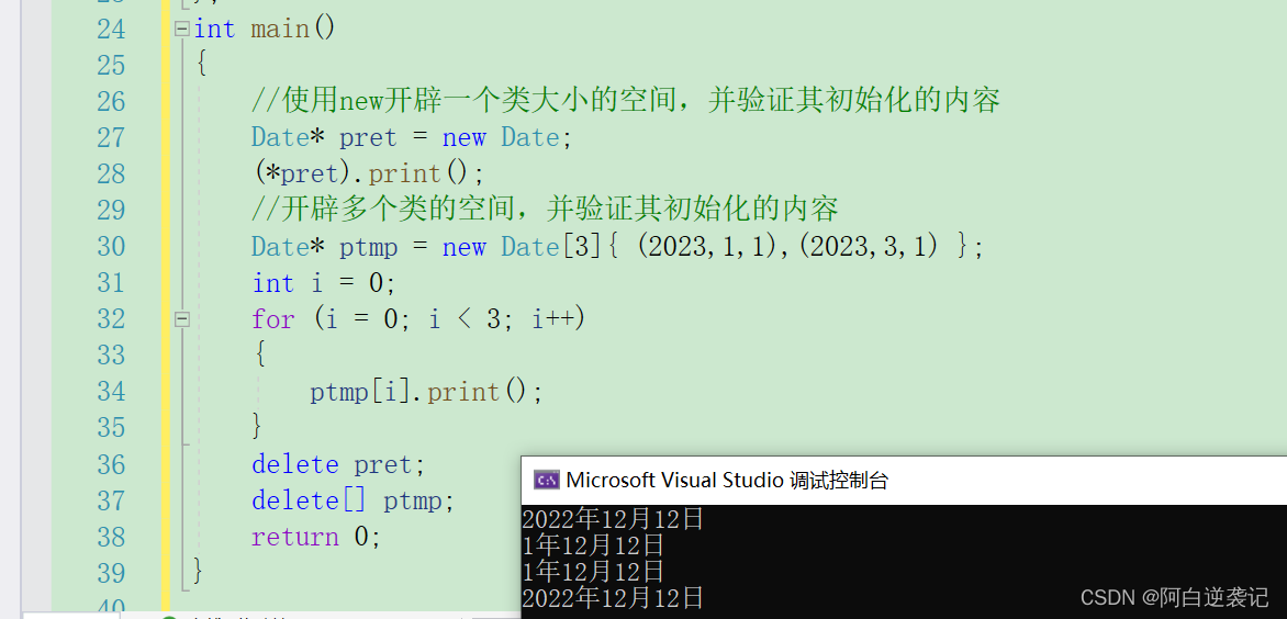 2.对具有默认构造的对象进行初始化,我们对于具有默认构造的函数进行初始化的情况,大多数都是针对于类来说的,我们通常会在类当中写一个构造函数,之后我们在使用new操作符开辟空间的时候就会自动调用类的构造函数进行对象的初始化。同样的,我们通过一段代码来学习具有构造函数的对象如何进行初始化: