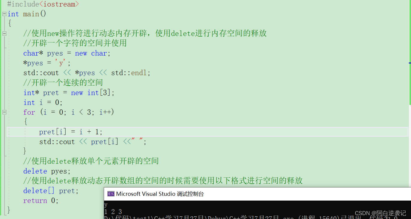 //使用new操作符进行动态内存开辟,使用delete进行内存空间的释放