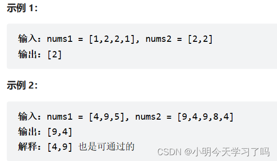 ,返回 它们的交集 。输出结果中的每个元素一定是 唯一 的。我们可以 不考虑输出结果的顺序 。