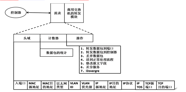 OpenFlow交换机:OpenFlow交换机是整个OpenFlow网络的核心部件,主要管理数据层的转发。OpenFlow交换机接收到数据包后,首先在本地的流表上查找转发目标端口,如果没有匹配,则把数据包转发给Controller,由控制层决定转发端口。