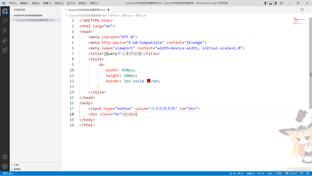 1、我们先说单个元素的创建,在一个div盒子里创建一个a标签,我们就需要先写入一个按钮和一个div盒子。如下图所示,要实现的功能就是点击按钮在盒子内创建一个表格。