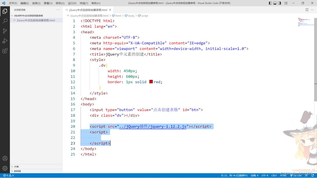 2、我们想要的功能需要通过jQuery来实现,所以先引入一个jQuery的插件,然后写一个script标签来写jQuery代码块。