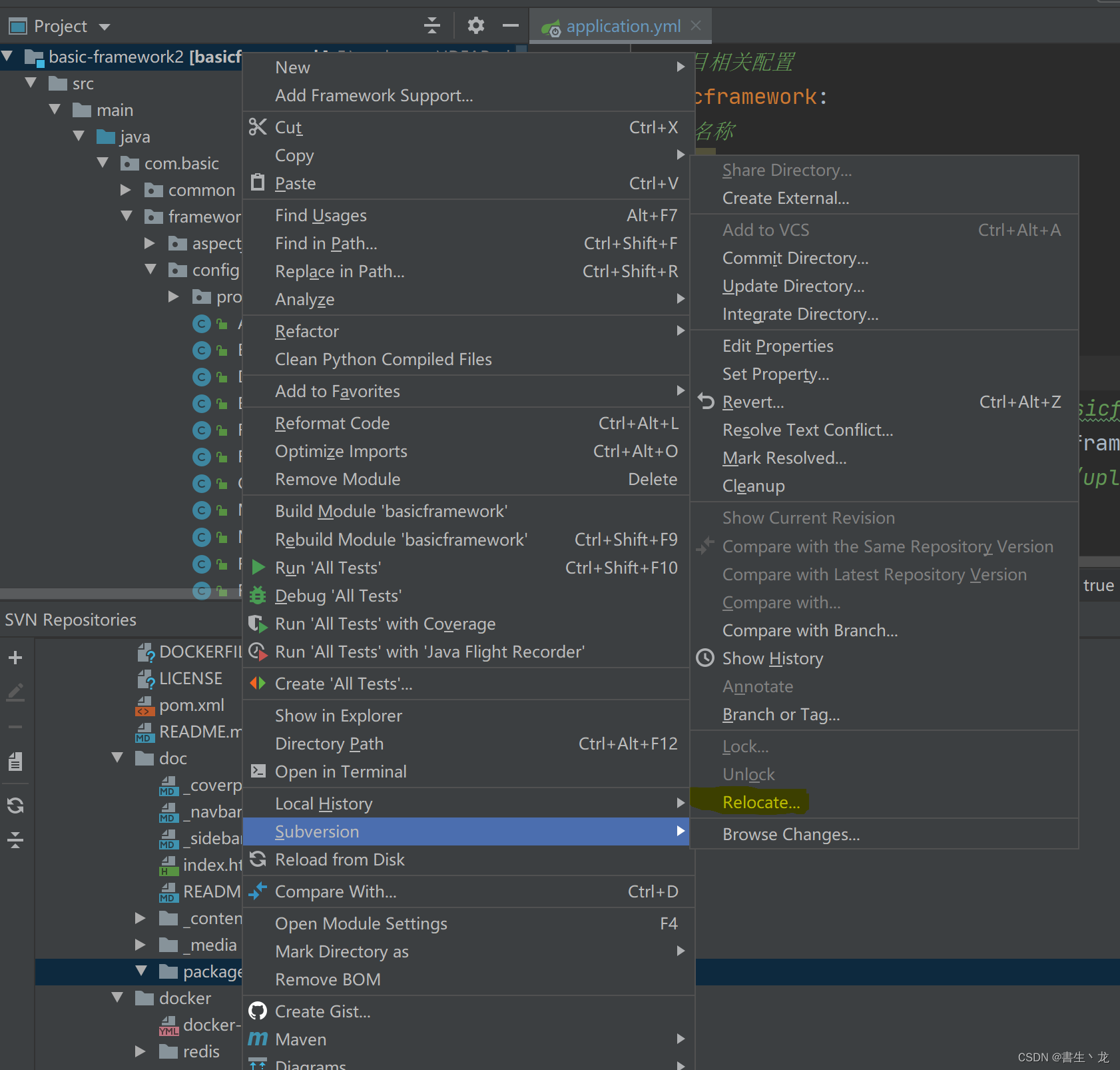 IDEA打开项目,右键项目,选择Subversion,选择Relocate