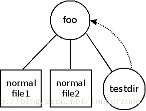 UNIX 文件系统的历史上,对目录的硬链接是可能的。但是这可能会在文件系统树中产生循环,而这会使得遍历文件系统变得混乱(在《Unix高级环境编程》中提到作者Steven在自己的系统上做过实验,结果是:创建目录硬链接后,文件系统变得错误百出)。一个目录甚至可以是自身的父目录,如下图显示,在目录foo中如果创建一个testdir 的硬链接指向 foo 本身,这样一个循环就出现了。嘿嘿,a lot of bad things will come !