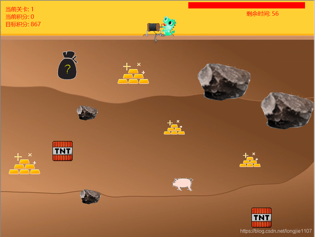 游戏界面就跟原版黄金矿工差不多了。中间的龙宝就是我们的“矿工”,它正在用它的舌头摇着拉杆。龙宝下方有着大大小小的金矿和石头,还有TNT,小猪,神秘宝藏。界面左上方是关卡和积分信息,右上方是剩余时间。