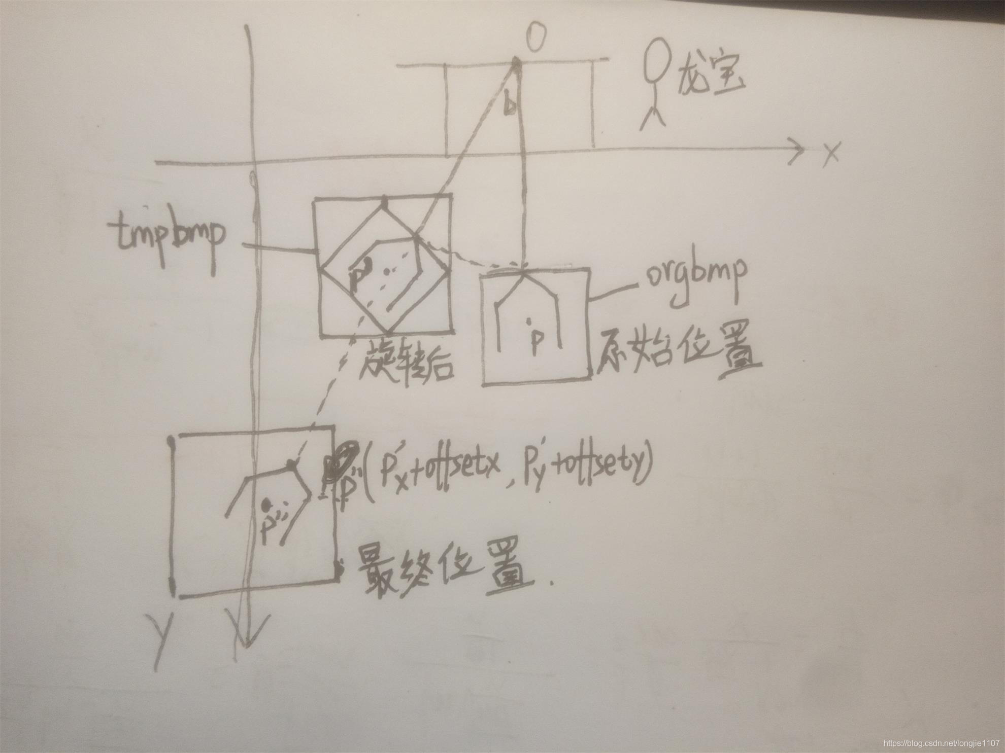 其中 P(x,y)为图形原先的位置,O(x0,y0)是旋转圆心的位置,b为旋转的角度,P’(x‘,y‘)为图形旋转后的位置。这里说一下b,该公式推导时,y轴是朝上的,这样得出的b若为正指图形绕逆时针旋转b角度。而MFC中y轴默认朝下,所以b为正时指图形绕顺时针旋转b角度,b是负数就是逆时针旋转,这一点是要注意的。