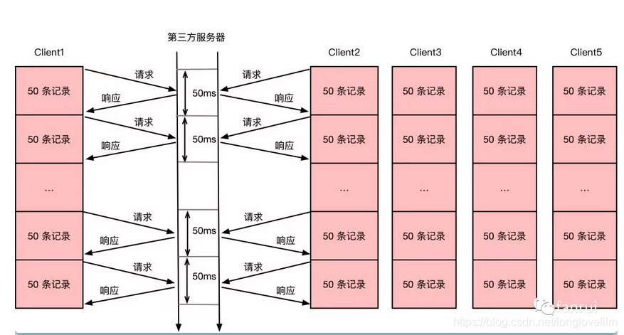这五个线程内分别使用同步批量请求的 Client,单个 Client 还是保持 50 条记录为一个批次,即 50 条记录请求一次第三方 api。请求第三方 api 耗时主要在于网络 IO(性能瓶颈在于网络请求延迟),因此如果变成 5 个 Client 线程,每个 Client 的单次请求平均耗时还能保持在 50ms,除非网络请求已经达到了带宽上限或整个任务又遇到其他瓶颈。所以,多线程模式下使用同步批量 api 也能将请求效率提升 5 倍。