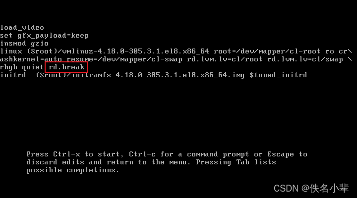 2、在linux后追加rd.break参数,按Ctrl-x进入救援模式。
