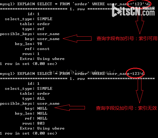 4.如果列类型是字符串,那一定要在条件中将数据使用引号引用起来,否则不使用索引